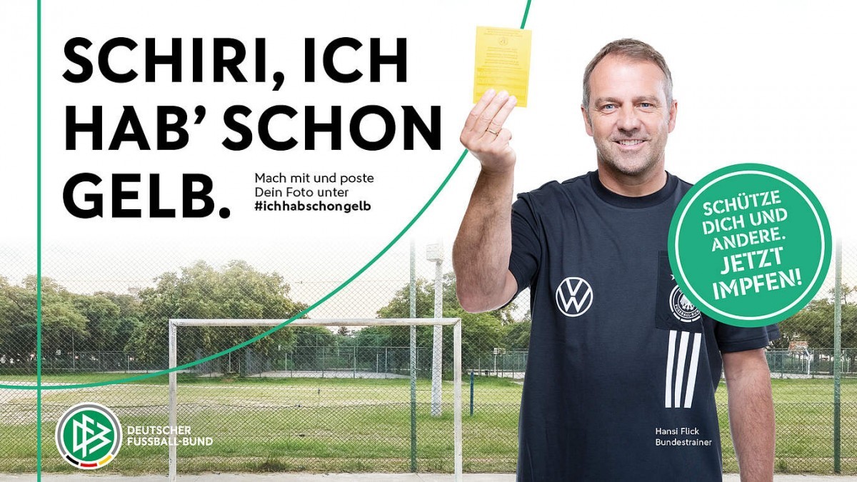 Der DFB wirbt unteressen weiter für Impfungen. Die Aktion "Schiri, ich hab' schon Gelb" wird unter anderem von Bundestrainer Hansi Flick unterstützt.