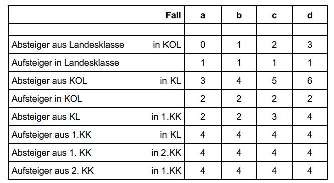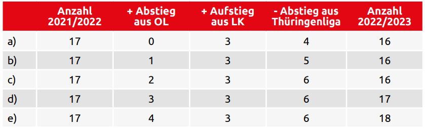 Wie dem auch sei. Bei drei oder vier Absteigern aus der Oberliga in die Verbandsliga (Thüringenliga), wird die Zahl der Absteiger aus der Thüringenliga in die Landesklassen auf 6 gedeckelt.