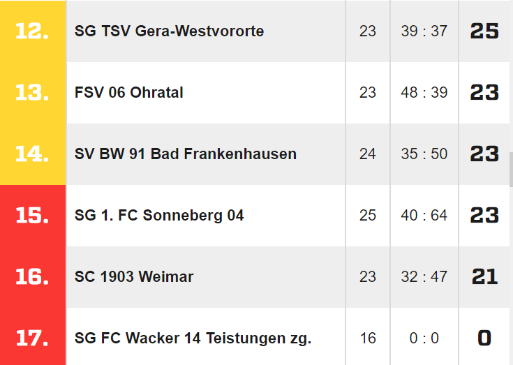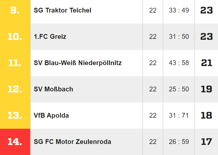 Stand jetzt (Ende Mai) würden mit dem FSV Wacker Nordhausen, SV 09 Arnstadt und FSV Martinroda gleich drei Teams in die Verbandsliga (Thüringenliga) absteigen. Da der FC Carl Zeiss Jena seine 2. Mannschaft ganz vom Spielbetrieb abmelden will, steigen die Hoffnungen vom FC An der Fahner Höhe nicht noch in den Abstiegsstrudel zu kommen.
