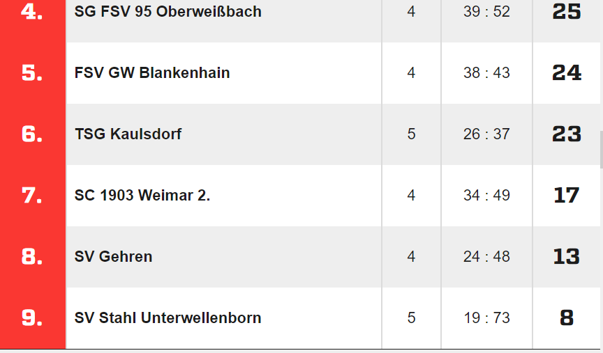 Bereits jetzt steht der SV Stahl Unterwellborn als Absteiger fest. Von einem Nicht-Abstiegsplatz sind der SV Gehren und der SC 1903 Weimar 2 schon weit entfernt. Akut gefährdet sind außerdem die TSG Kaulsdorf, der FSV Grün-Weiß Blankenhain, die SG FSV 95 Oberweißbach und die SG Wachsenburg Haarhausen. Sie trennen nur zwei Punkte. Kaulsdorf hat mit einem Spiel mehr und den wenigsten Punkten (23) die größten Sorgen. Hoffen können alle, dass es zwei Aufsteiger aus der Kreisoberliga Mittelthüringen in die Landesklasse 1 gibt. Dann gibt es einen Absteiger aus der Kreisoberliga weniger. Aber dafür dürfte nur maximal ein Team aus der Verbandsliga (Thüringenliga) in die Landesklasse 1 absteigen. Also Daumendrücken für Gera-Westvororte und den SC 1903 Weimar!