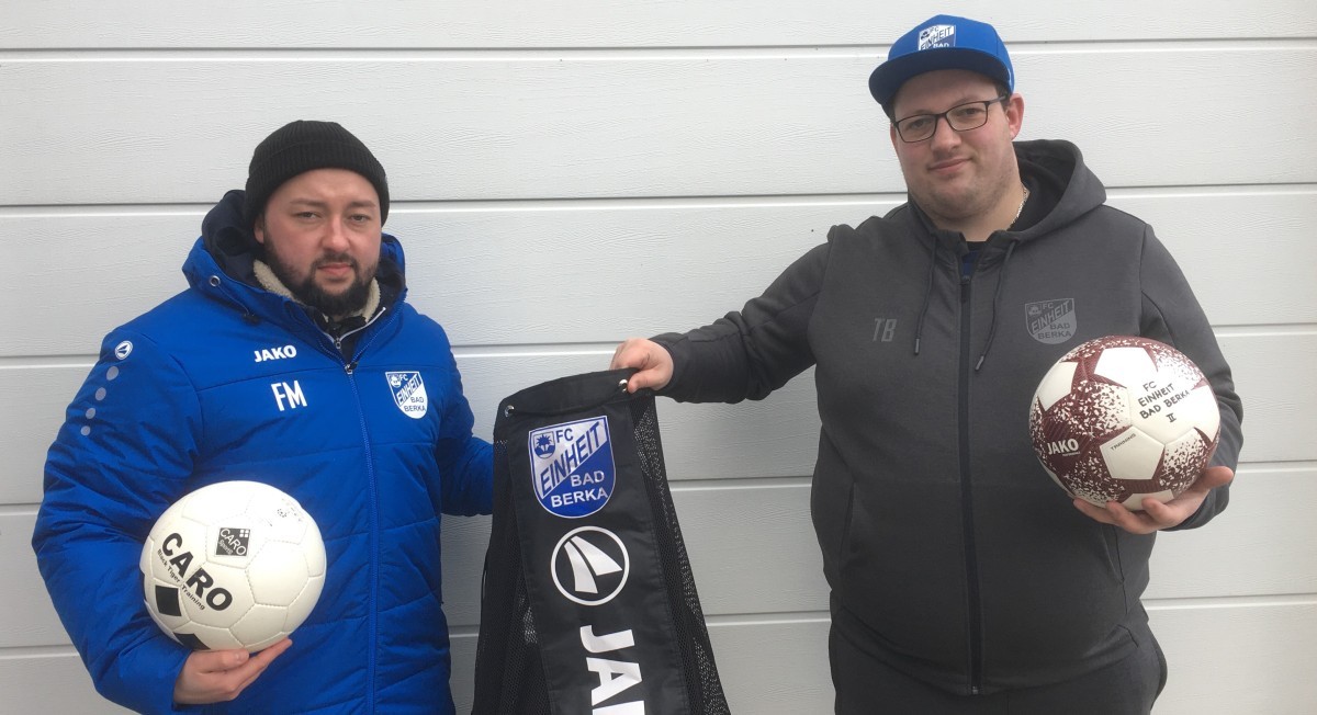 Der zur Zentralklinik Bad Berka gehörende Kindergarten "Waldspatzen" kann sich über Fußbälle der zweiten Männermannschaft des FC Einheit Bad Berka freuen. Die ausrangierten Trainingsbälle wird Co-Trainer Florian Margean (auf dem Foto links neben Trainer Toni Bauchspieß) der in der Kita arbeitet, in der kommenden Woche überreichen. Die Einheit-Reserve wird sich dagegen in der Rückrunde mit neuen Trainingsbällen von unserem Ausstatter Kabine 38 auf die Spiele vorbereiten. Der FC Einheit unterhält seit vielen Jahren Kooperationen mit Kindergärten und Schulen in Bad Berka.