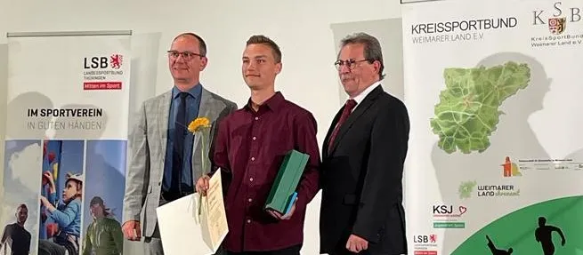 Der erst in der vergangenen Woche vom Kreisspsortbund Weimarer Land als Nachwuchsschiedsrichter des Jahres ausgezeichnete Jan Vogt (im Bild mit KSB-Präsident Hans-Jürgen Häfner und Bürgermeister Michael Jahn, links) hat eine weitere "Würdigung" erhalten. Er ist als bester junger Schiedsrichter vom Fußballkreis Mittelthüringen als Unparteiischen bei einem U14-Sichtungsturnier des Deutschen Fußballbundes dabei. Noch bis Montag, 12. Juni, leitet er zusammen mit neun weiteren Schiedsrichtertalenten aus Thüringen und Sachsen die Ländervergleiche in der Landessportschule in Bad Blankenburg. Jan Vogt hatte sich durch seine herausragenden Lehrgangsergebnisse und ebenso guten Bewertungen seiner Spielleitungen in der Fußball-Kreisoberliga der Männer den Platz im Schiri-Team des DFB-Turniers erarbeitet.