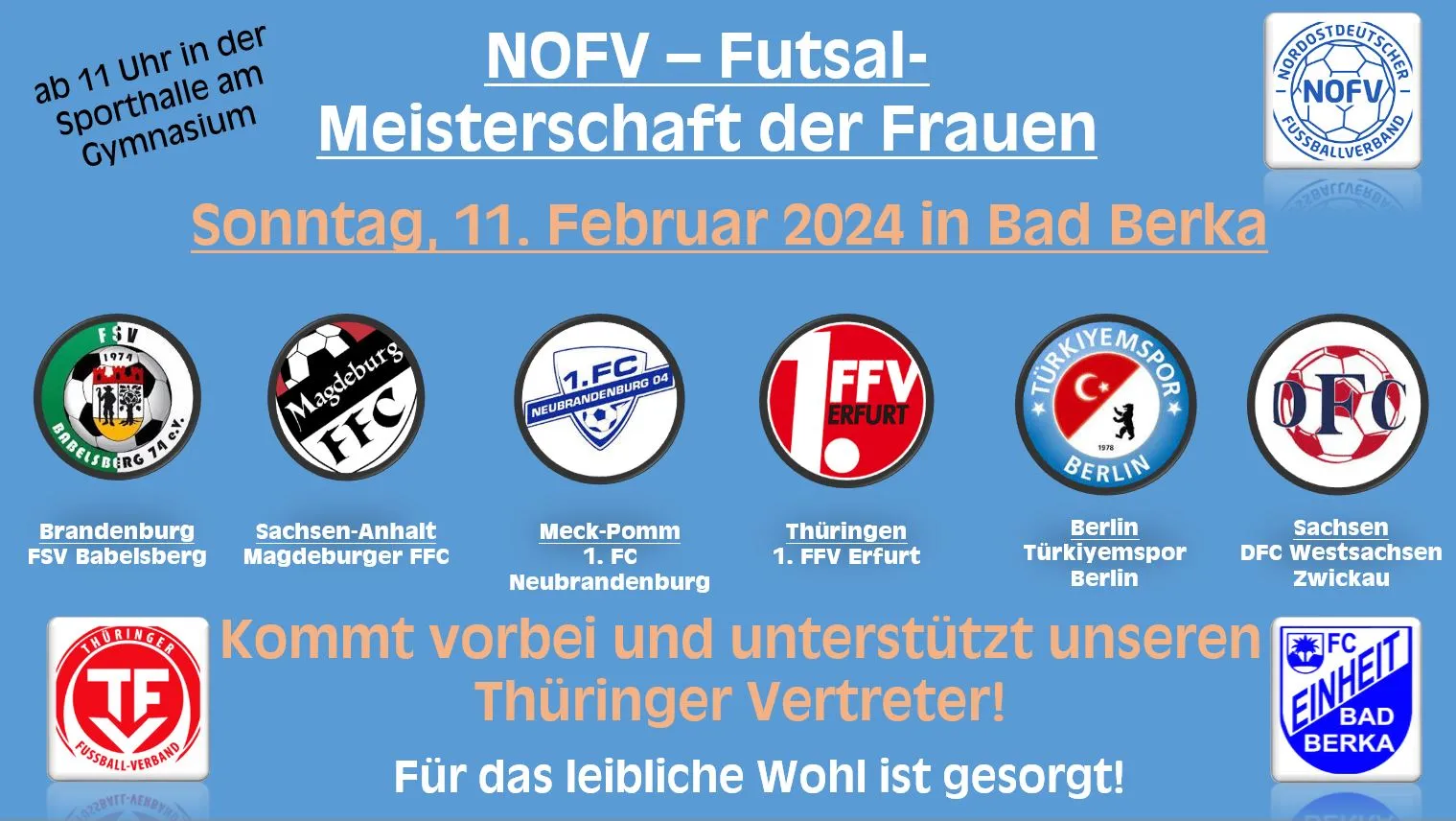 Am Sonntag, 11.02.2024 ab 11 Uhr findet in der Sporthalle am Gymnasium in Bad Berka die diesjährige Futsal-Meisterschaft für Frauen des Nordostdeutschen Fußballverbandes statt.