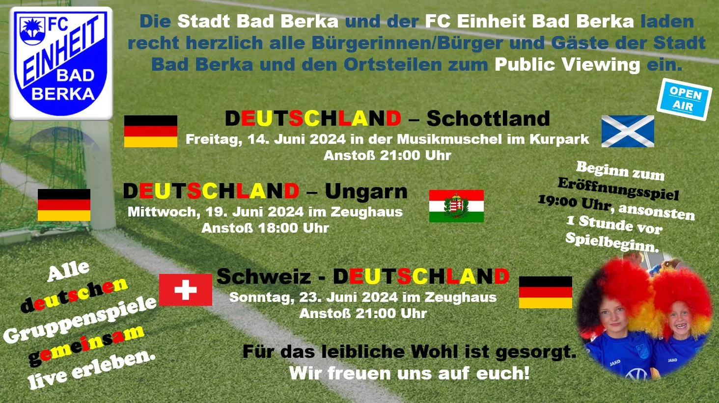 Die Stadt Bad Berka und der FC Einheit Bad Berka laden alle Bürgerinnen/Bürger und Gäste der Stadt Bad Berka und den Ortsteilen recht herzlich zum Public Viewing ein.