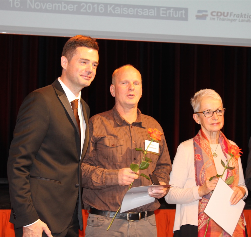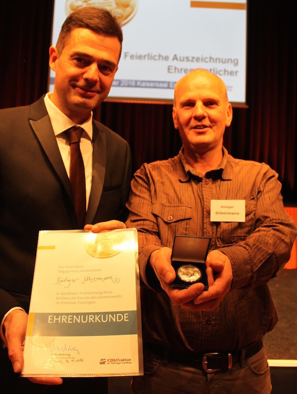 Ein Vierteljahrhundert lang opferte er als Spieler, Trainer, Vereins-Chef und Schatzmeister jede freie Minute für den Fußball in Bad Berka. Dieses Lebenswerk weckte jetzt die Aufmerksamkeit der CDU-Fraktion im Thüringer Landtag, die einmal im Jahr die herausragendsten Engagements von Ehrenamtlichen im Freistaat würdigt. Das Publikum am Mittwoch-Abend im Erfurter Kaisersaal hatte Roger, wie Rüdiger Silbermann (54) von allen genannt wird, mit seinem unnachahmlichen Charme, schnell auf seiner Seite. Eine Produkltionsfirma drehte sogar einen Film (siehe Youtube-Video unten).