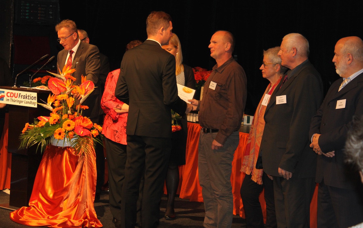 In der Laudation wurde sein großes Herz und der selbstlose Umgang mit den 290 Mitgliedern in 18 aktiven Mannschaften in einem der größten Vereine des Weimarer Landes betont. CDU-Landes-Chef überreichte ihm eine Urkunde, eine "Silber-Münze" und eine Rose für Ehefrau Carmen, die ihm all die Jahre tatkräftig zur Seite stand. Auch der Vorstand des FC Einheit Bad Berka, Spieler, Trainer, und Fans sagen Herzlichen Glückwunsch!