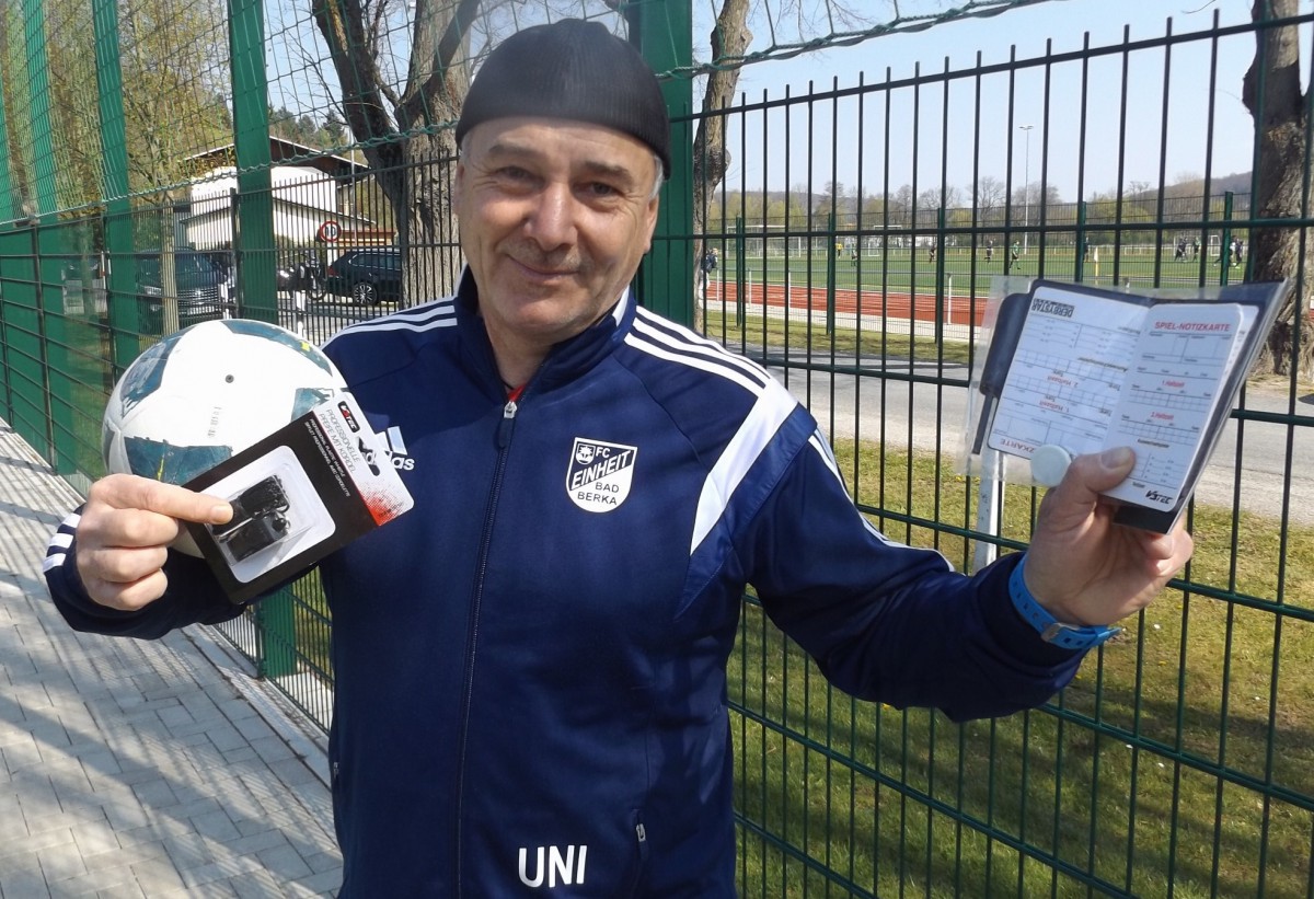 Frank Unrein ist neuer Vereinsschiedsrichter des FC Einheit Bad Berka. Am Sonnabend leitete er als Unparteiischer sein erstes Pflichtspiel. Die Schiedsrichterausbildung hatte er bereits im Februar absolviert. Symbolisch für seine neue Aufgabe ist ihm eine Grundausstattung - Pfeife, gelbe und rote Karte und Schiedsrichterkarten - überreicht worden.