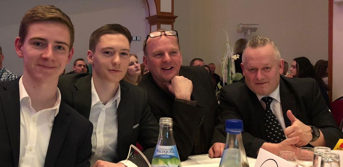 Mit Alex Schindler (links) freuen sich Vereinschef Holger Koch (von rechts), Kassenwart Rüdiger Silbermann und Neu-Vereinsschiedsrichter und Spieler Felix Billeb über die Auszeichnung.